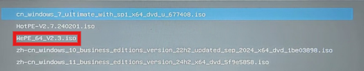 Ventoy 界面用 ↑↓ 选中「WePE_64_V2.3.iso」→ 回车。